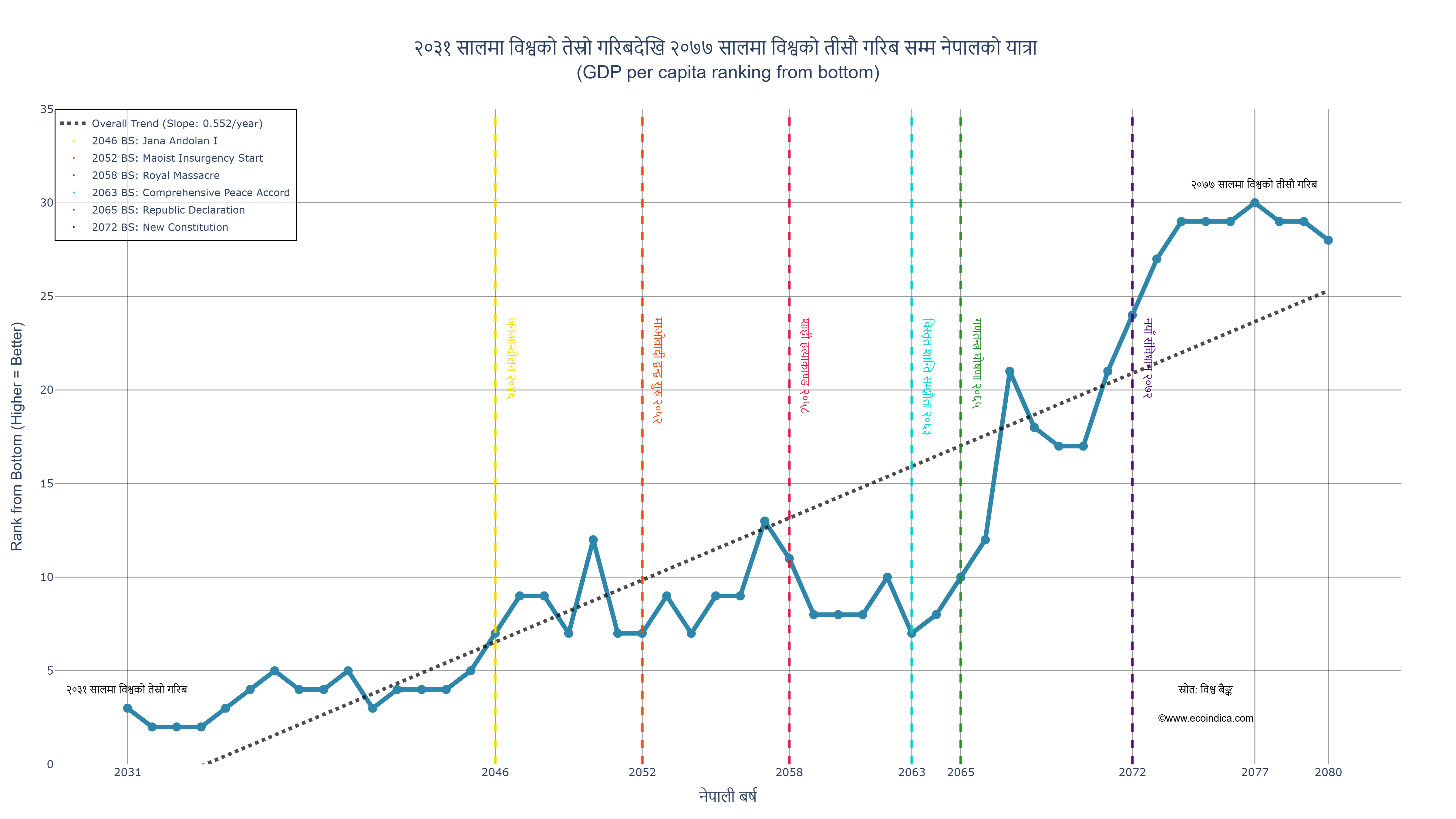 Nepal’s economic journey, as measured by GDP per capita rankings, reflects a story of resilience and gradual progress amidst significant political changes. From the Nepali year 2031 BS (1974 CE) to 2080 BS (2023 CE), Nepal climbed from being the world’s third poorest country to the 30th poorest by 2077 BS (2020 CE) and further to the 28th poorest by 2080 BS (2023 CE). This trajectory, visualized in the chart above, highlights key milestones:
